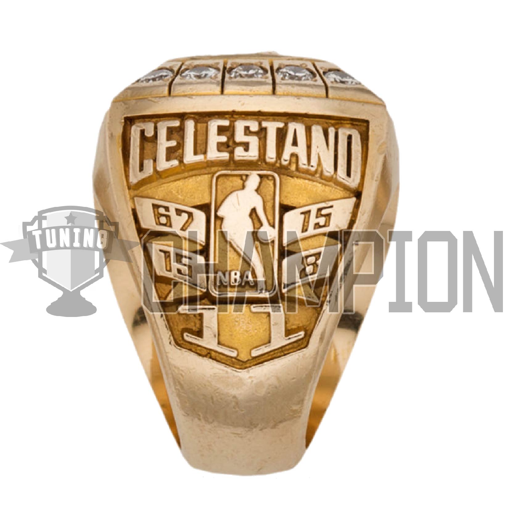 On one side, the player’s name and number are cut out along with the NBA logo and regular season/playoff record. The other side shows the NBA championship trophy which has a 1/4 carat brilliant cut diamond as the ball. A triangle representing the triangle offense is behind the trophy.