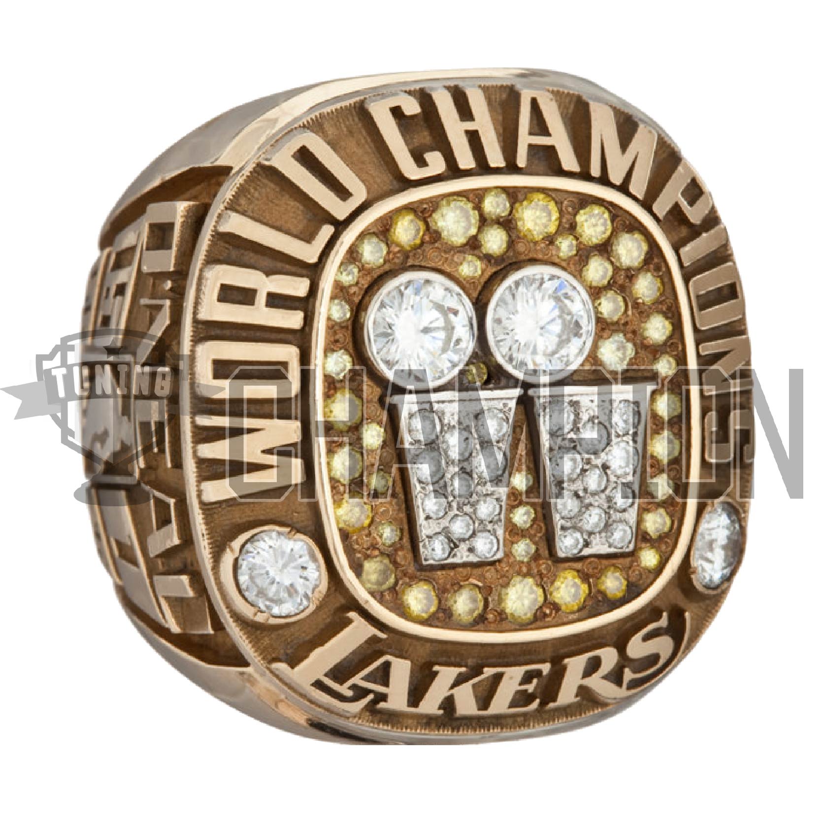 The ring, which represents the 2001 NBA Championship is completely manufactured in the United States in Masters of Design’s own factory. The ring which weighs approximately 42 pennyweights of 14 Kt. yellow gold contains approximately 1.07 carats of white diamonds. The ring’s top is paveed in brilliant genuine yellow diamonds. The yellow diamonds weight approximately .60 carats. This is the first time in NBA history genuine yellow diamonds are being used. On top of the yellow diamonds are two diamond encrusted NBA Championship trophies. The bezel has the world “WORLD CHAMPIONS.” At the bottom of the bezel, the word “LAKERS” is in the Lakers’ type face. There are two bezel set diamonds on the bezel.