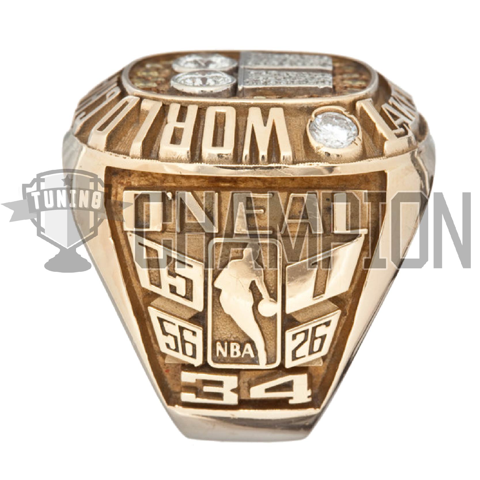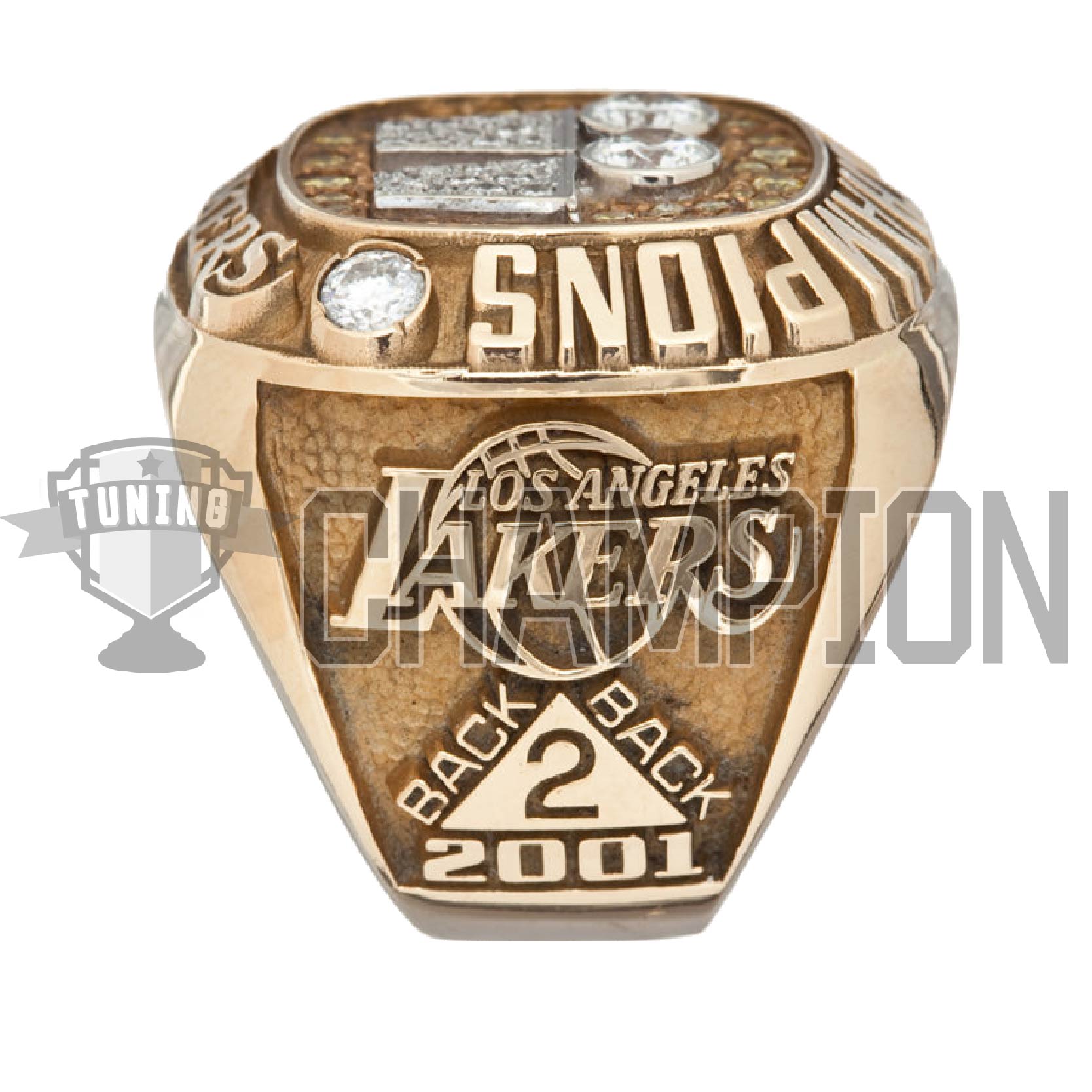 On one side of the shank is the full Lakers logo and the words “BACK 2 BACK” in a triangle to represent the Triangle offense of the Lakers. The year 2001 is at the bottom of that side. The other side has the player’s name cut out and his number. In the middle is the NBA logo and the numbers 15-1, which represents the playoff record of the Lakers – the best in league history. The overall season record is also on this side. The largest ring size is 15 1/2, the smallest is 8 1/2.