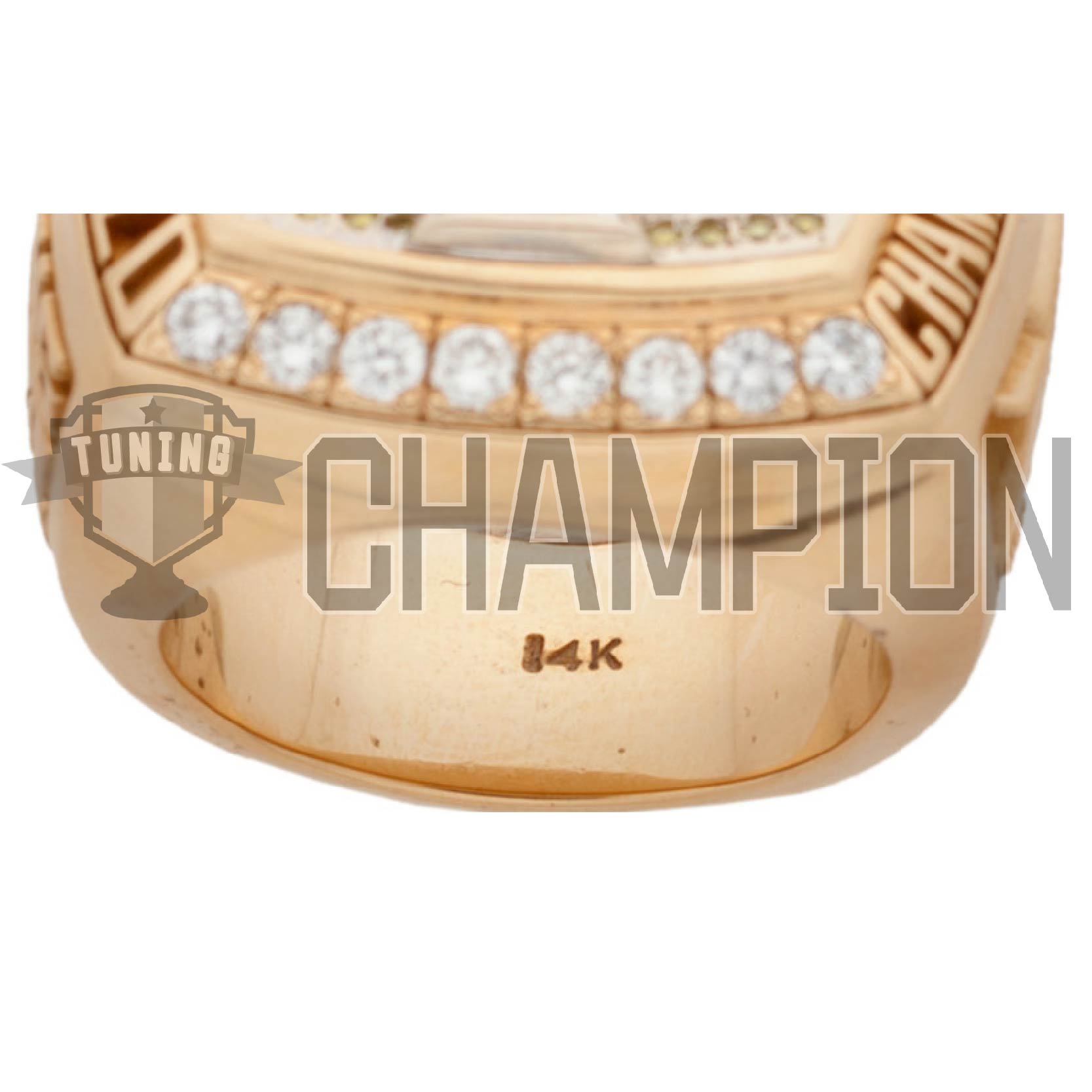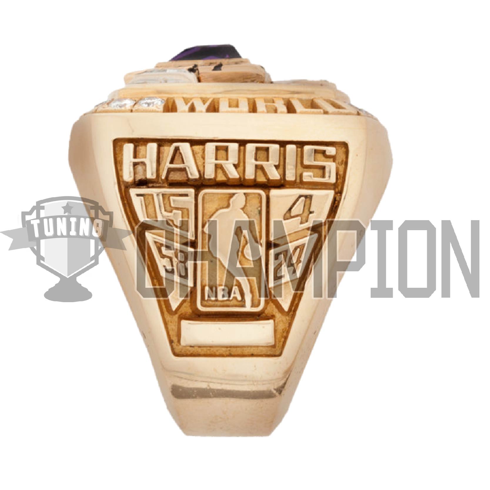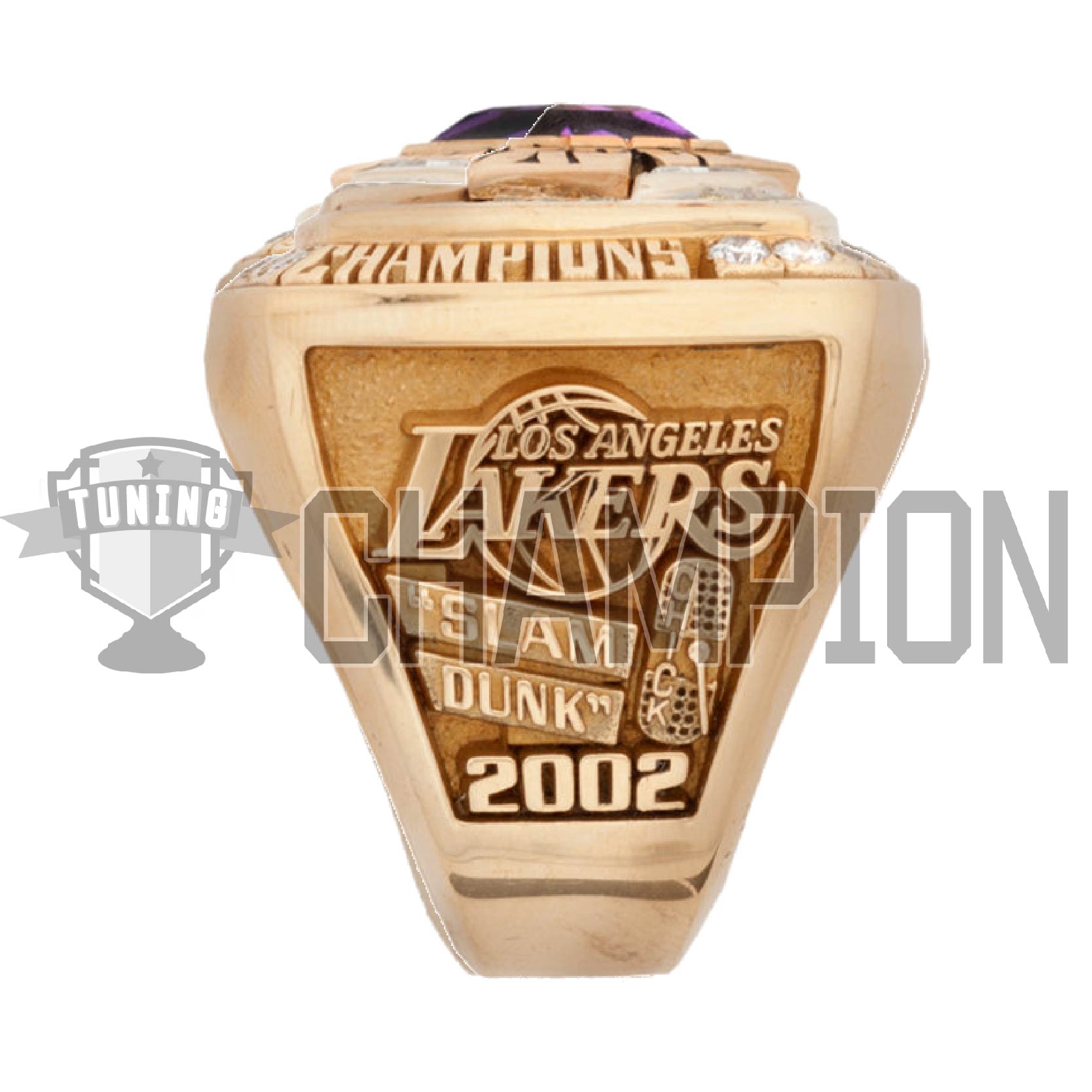 On the top, 61 round yellow diamonds are weighing approximately .75Ct. total weight. These stones are set in yellow gold. The yellow diamonds represent one of the official colors of the Lakers. In the center of the top is a 1.50Ct. genuine amethyst, which is a bezel set. The color of the amethyst represents purple, the other official color of the Lakers. Around this bezel are the words “BACK BACK BACK”, representing the three consecutive championships. There are also 3 trillion cut genuine white diamonds weighing approximately .75Ct. the total weight which represents the three championships in a row and the triangle offense.