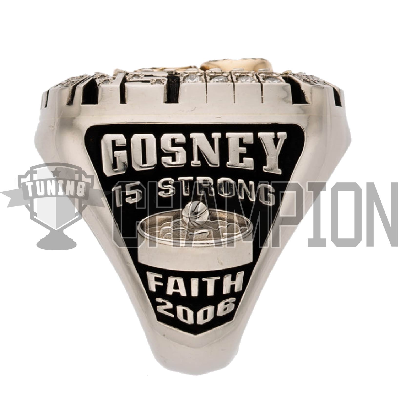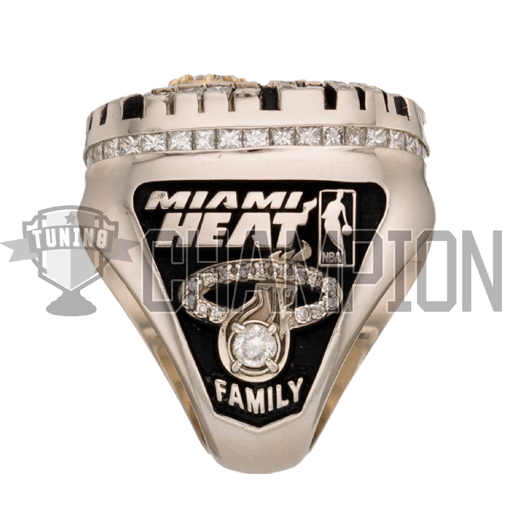 2006 Miami Heat NBA Championship Ring 2006 Miami Heat NBA Championship Ring2006 Miami Heat NBA Championship RingLed by Dwayne Wade and Shaquille O’Neal, the 2006 Miami Heat won their first NBA title. This ring was presented to Shaq’s cousin (and bodyguard) Andre Spellman. The top has 37 real diamonds surrounding “WORLD CHAMPIONS” and a diamond studded basketball and hoop combination. One shank has “SPELLMAN” and the terms “15 STRONG” and “FAITH” plus the year “2006.” The other has the team name, NBA logo, Heat logo and “FAMILY.” Within the band is engraved with “JOSTENS 10K” and the name “Andre Spellman.” The ring weighs 60 grams and is size 11. Comes with a replica presentation box, similar to original boxes made. Excellent condition.