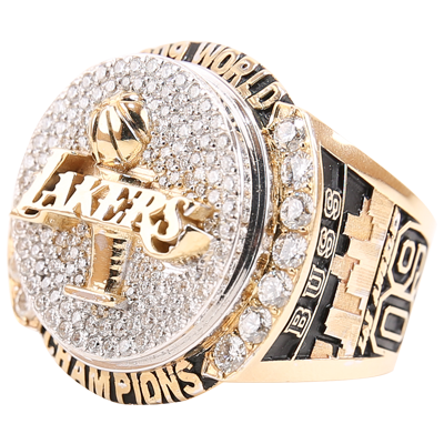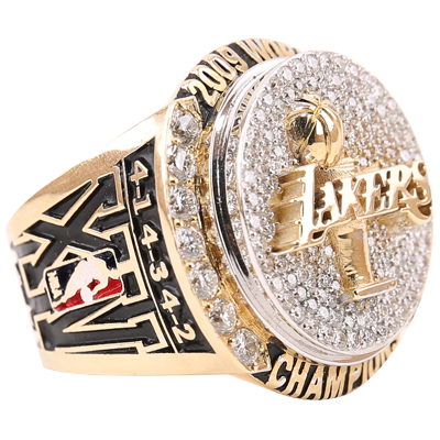Per the request of Dr. Buss, there are 14 diamonds surrounding the top of the ring symbolizing the previous 14 franchise championships, with the Larry O’Brien trophy in the middle to represent the 2008-09 title.