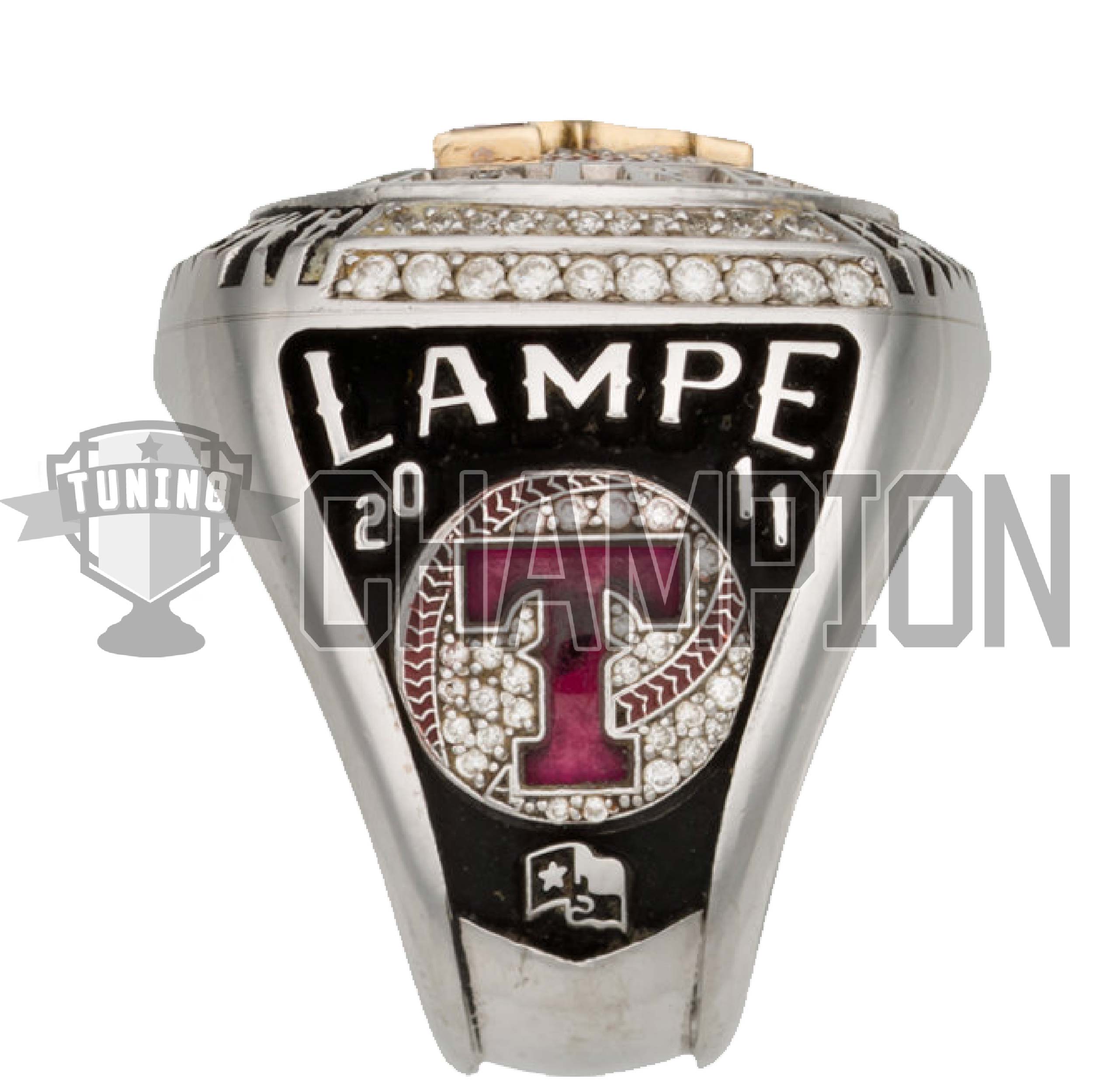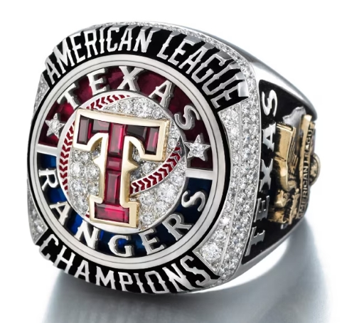 2011 Texas Rangers American League Championship Ring. Twice the Rangers worked the St. Louis Cardinals down to a single strike from the World Championship, but as Yogi Berra so eloquently stated, “It ain’t over ’til it’s over.” And so the team that had proven itself to be the best in the American League for two consecutive seasons was forced to settle for the runner-up prize, such as that which we present here. This is the “B version” of the ring, presented to the Rangers bat boy.