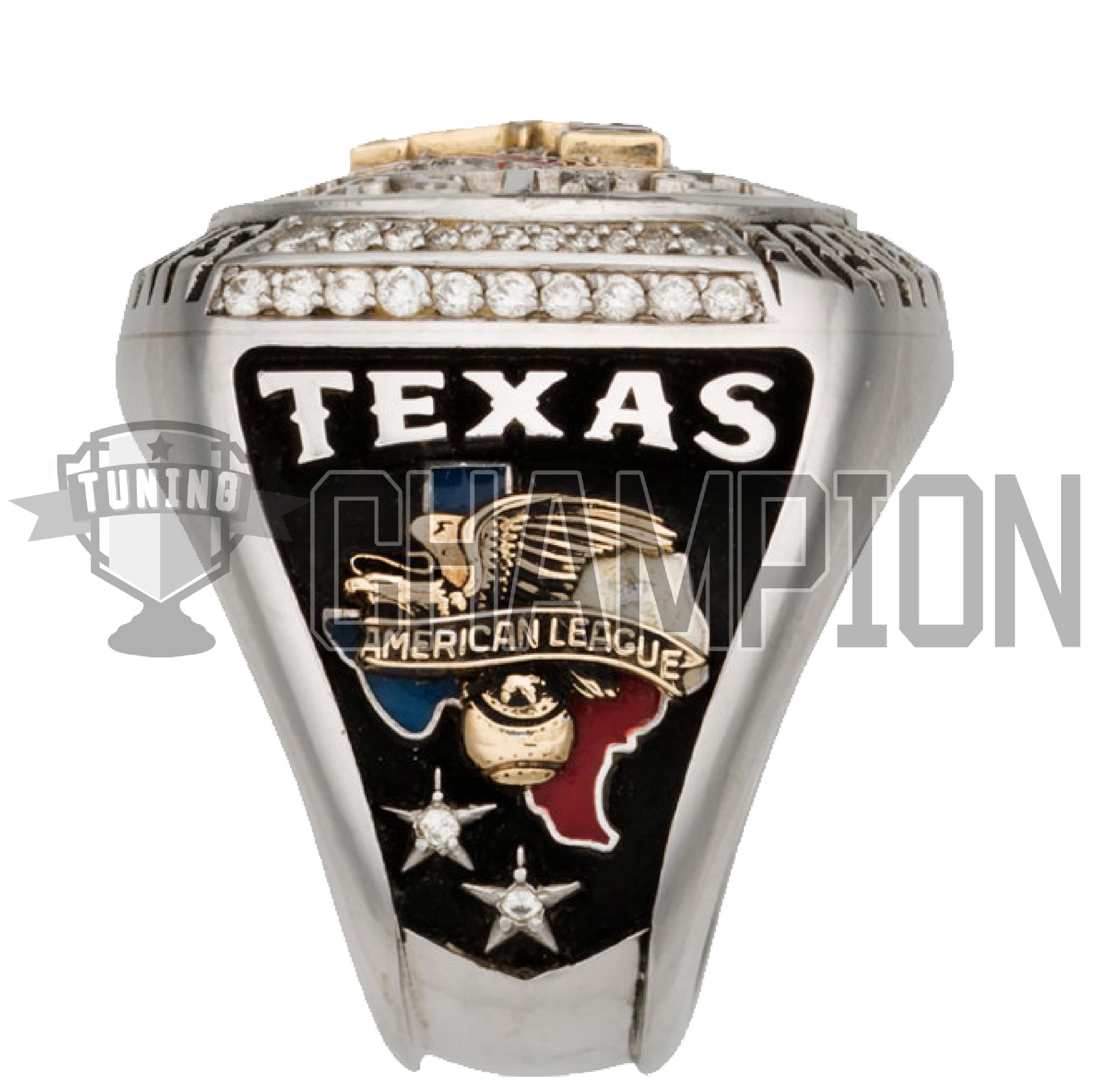 The gorgeously crafted white gold design features a logo “T” built of rubies on the face on a diamond-studded baseball, with “Texas Rangers” applied above semicircles of rubies and sapphires. Still more diamonds divide the words “American League” from “Champions” at top and bottom. Left shank identifies the owner by surname above a diamond-studded baseball emblazoned with another logo “T” crafted in ruby. Right shank reports “Texas” above an outline of the state filled with rubies and sapphires, with the logo of the American League atop. Two stars made of single diamonds here represent the franchise’s back to back pennants.