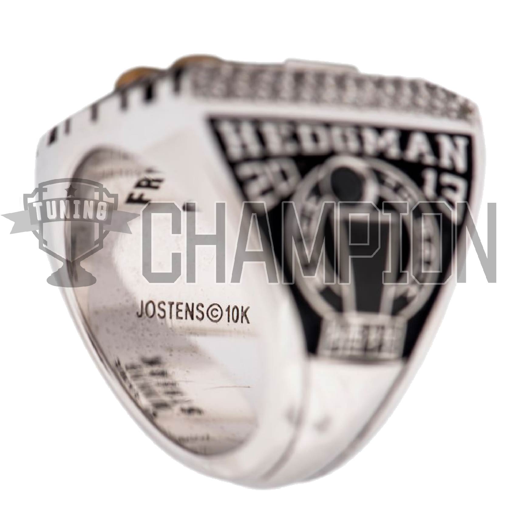 The 2013 ring, which was created by Jostens, weighs a total of 135 grams and includes 242 round-cut diamonds, 16 custom baguette-cut diamonds and three black onyx stones. The total weight of the gems is 10.3 carats.