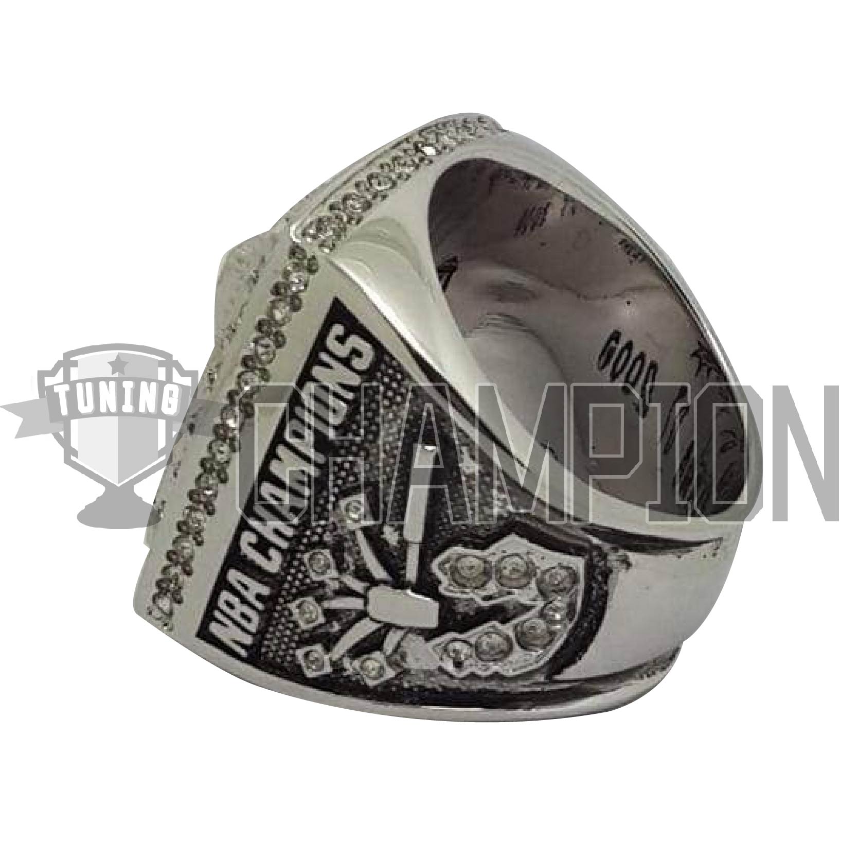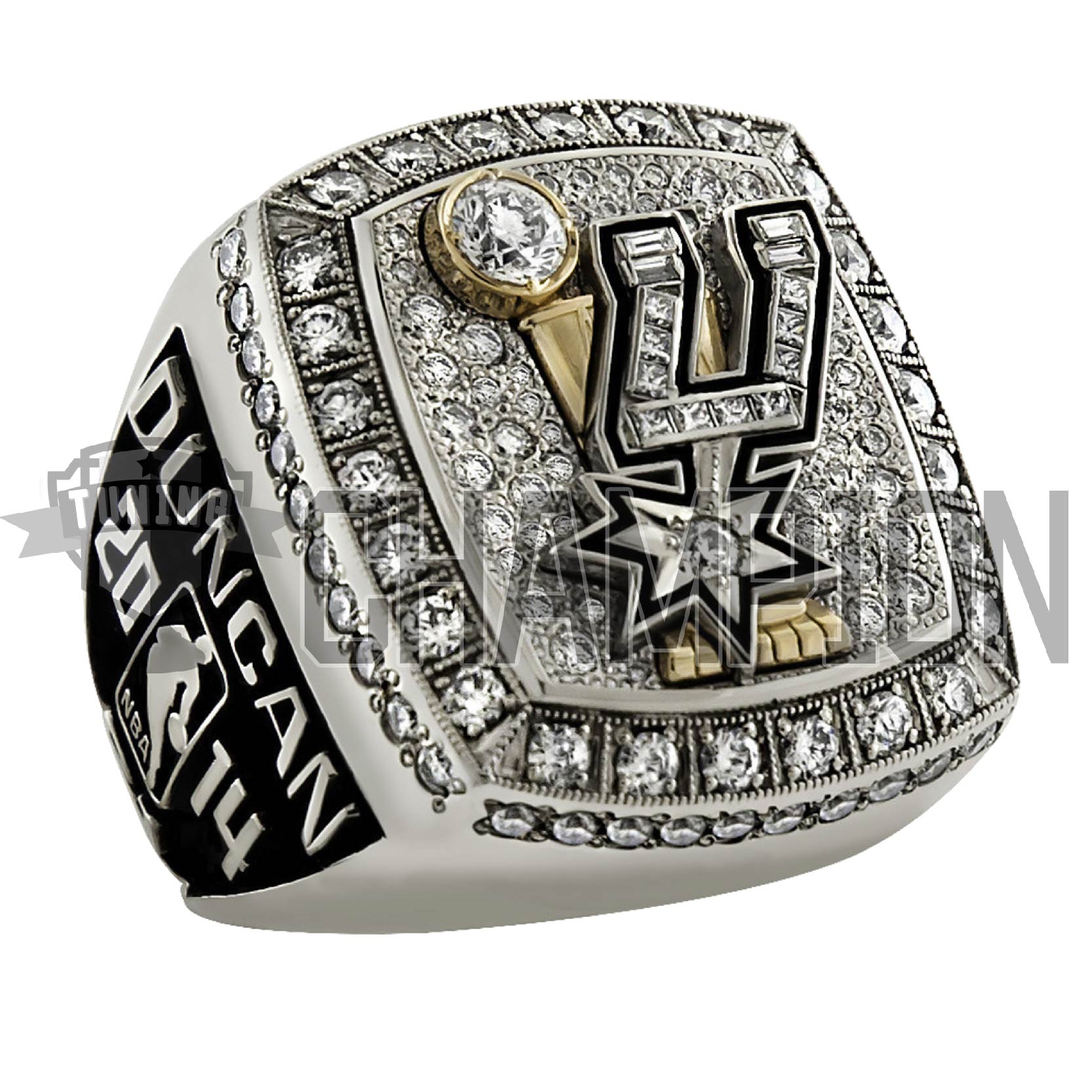 The left side of the ring showcases the player’s name and number along with the NBA logo and winning year 2014. The right side of the ring showcases the Spurs “Pounding the Rock” symbol containing 22 round diamonds. There are five sparks shooting out from the rock which will contain the number of diamonds that coincide with the number of championships an individual player is associated with.