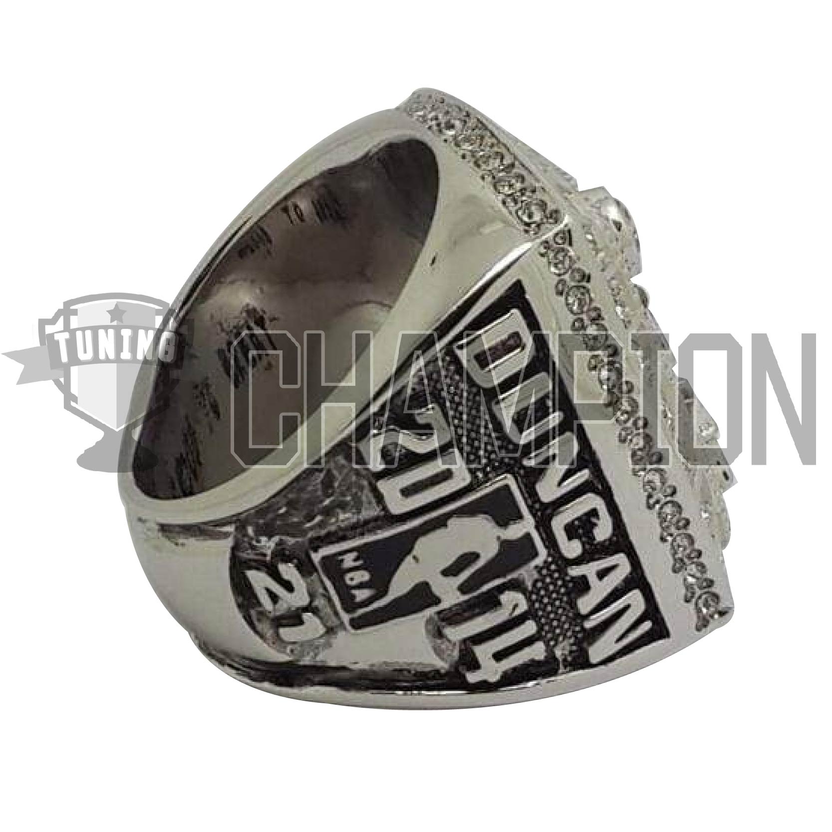 The Championship ring contains more than three ounces of 14 carat white gold with 5.09 total carat weight of diamonds. The top includes 76 round, 10 princess cut, and four baguette diamonds. Around the edge of the top are 42 round diamonds.