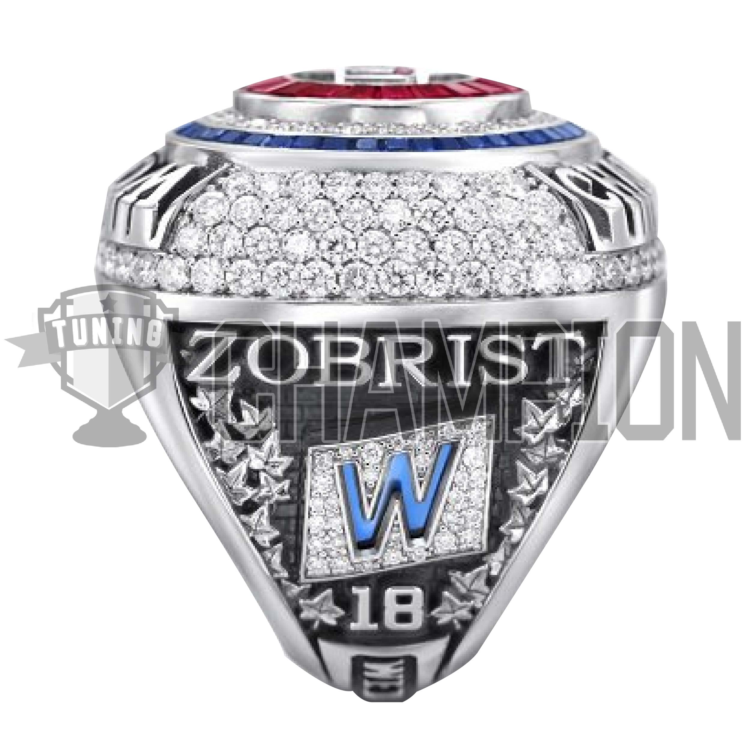 The player rings start out with 108 round diamonds on the top bezel. It’s no coincidence that the number matches the 108 years between World Series Championships.