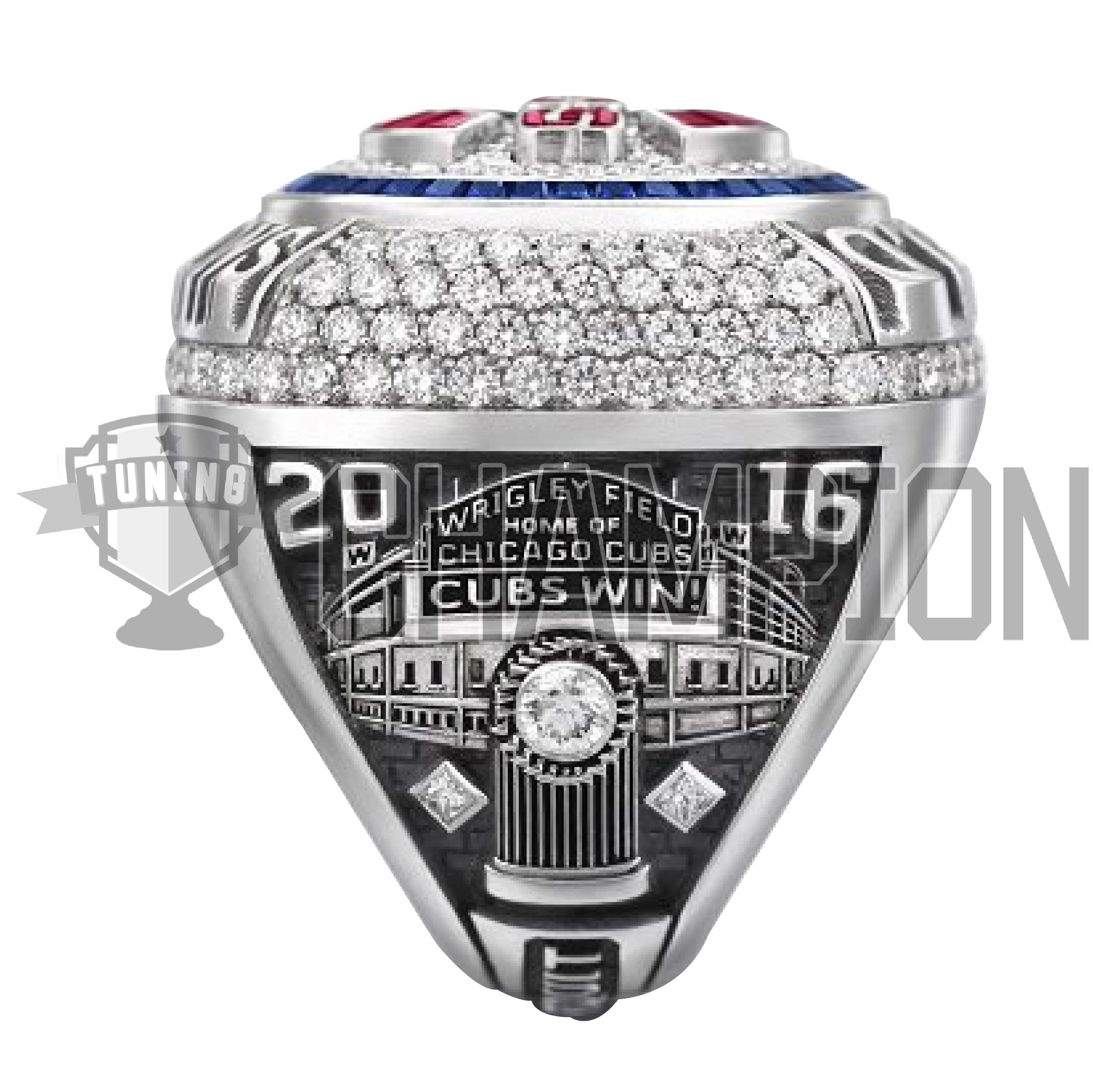 The other side of the Chicago Cubs 2016 World Series rings has the Wrigley marquee along with the World Series trophy. A large diamond sits in the middle of the trophy while a pair of princess cut diamonds are on either side.