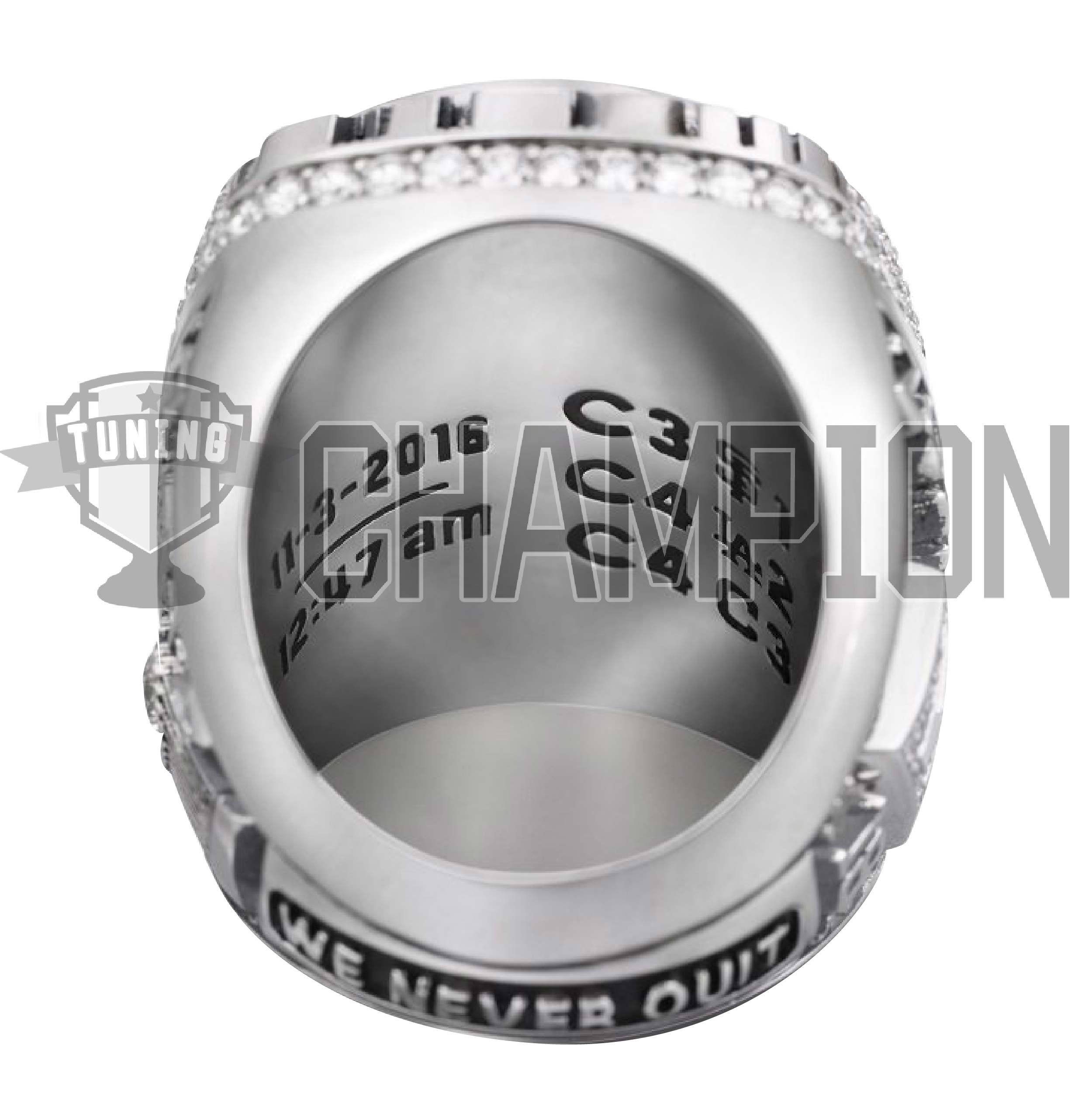 The bottom reads, “We never quit,” the team’s motto throughout the 2016 season. On the inside, there’s the date and time of the final out, the logos of the teams they beat in the postseason and each series’ details. And, yes, there’s even a silhouette of the Wrigley Goat, which had apparently cursed the team for decades.