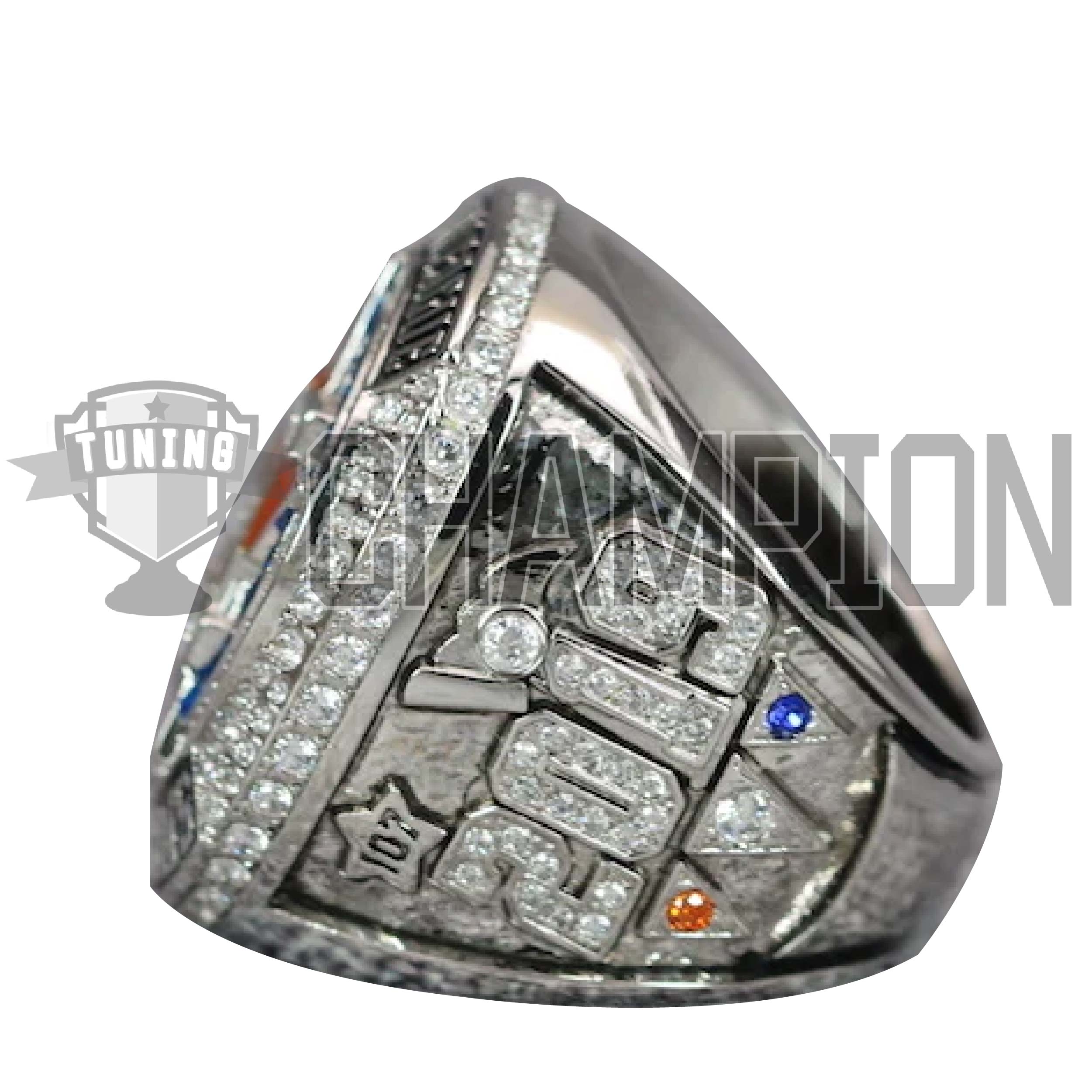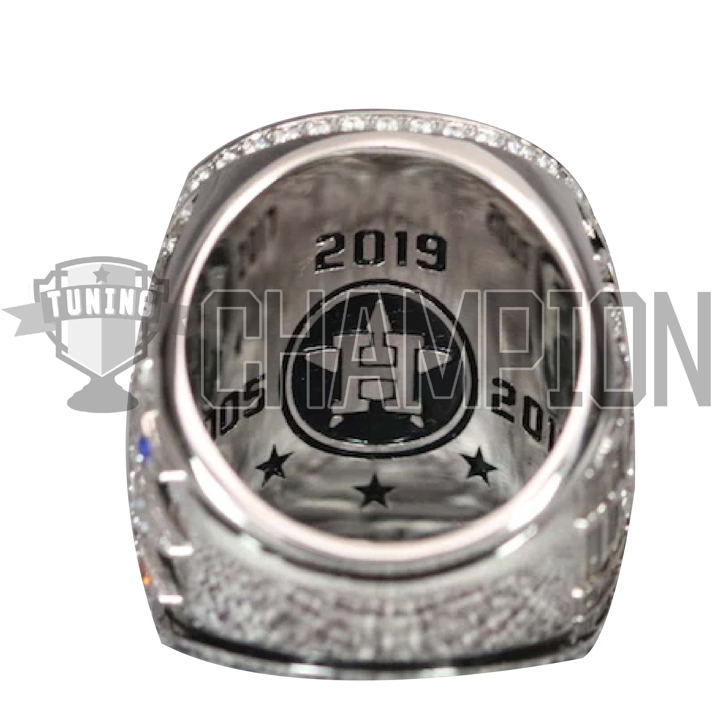 The top of the ring features the Houston Astros team logo with the “H” consisting of 11 diamonds representing the 11 games the Astros won in the postseason. One side of the ring features the player/coach’s name and number, while the other side features 2019 and 107, representing the Astros’ 107 regular season wins.