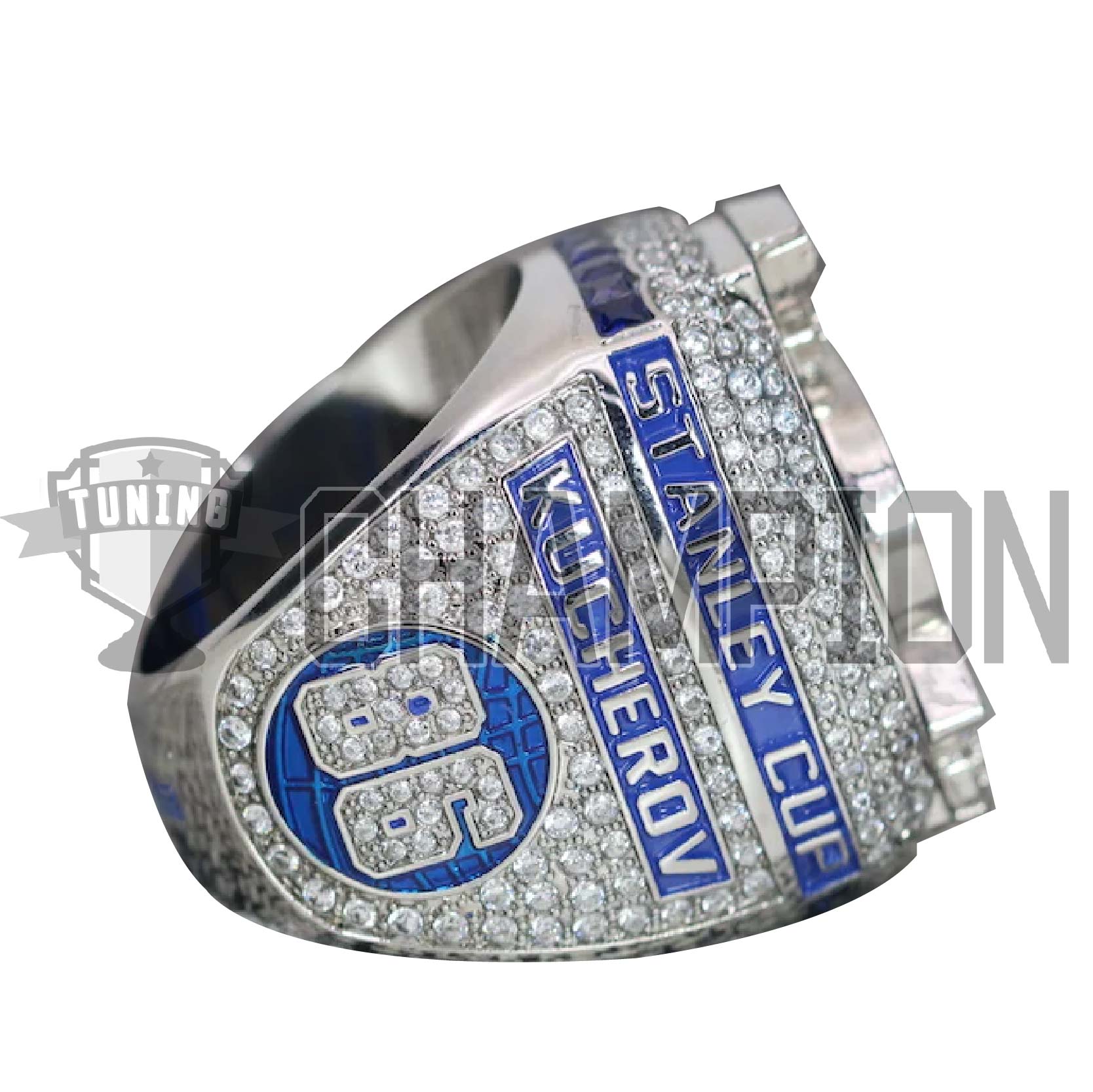 The left side of the ring features the words STANLEY CUP and the right side displays CHAMPIONS, set in raised white gold against a contrasting background of Lightning blue.