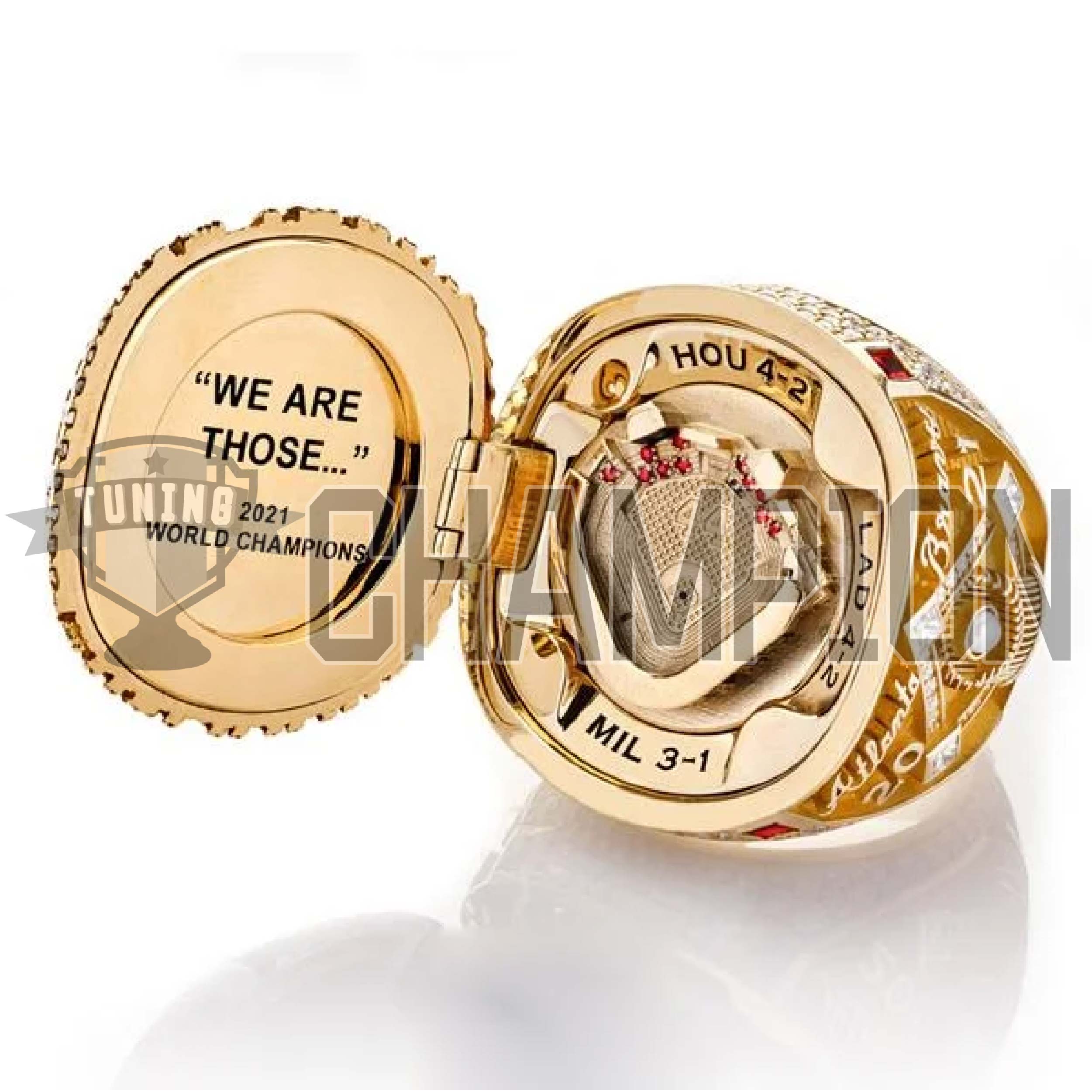 “FOR THE A” appears surrounded by diamonds on the bottom of the ring. And in one engraving, the words “WE ARE THOSE…” appear with the words “2021 World Champions,” a nod to Pederson’s rally cry of “We are those mfers.”