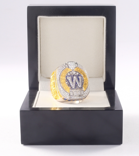 The face of the dazzling keepsakes features the club’s iconic “W” logo outlined in blue enamel sitting atop the diamond-studded Grey Cup and surrounded by a contrasting halo with raised lettering spelling out the phrase “Grey Cup Champions.”