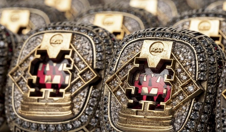 The rings feature a large M over S in the top center, surrounded by many diamonds. The logo is the centerpiece of a large national championship trophy.