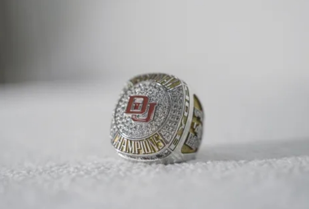 The championship rings are encrusted with 70 stones on the dome. The DU logo is at the center, with the words “National Champions” on the top and bottom. There are nine crimson stones looped around the edges to represent each of the program’s national titles, tied with Michigan for the most in college hockey history.