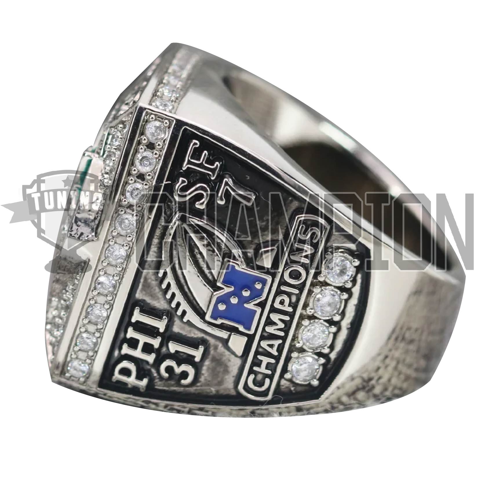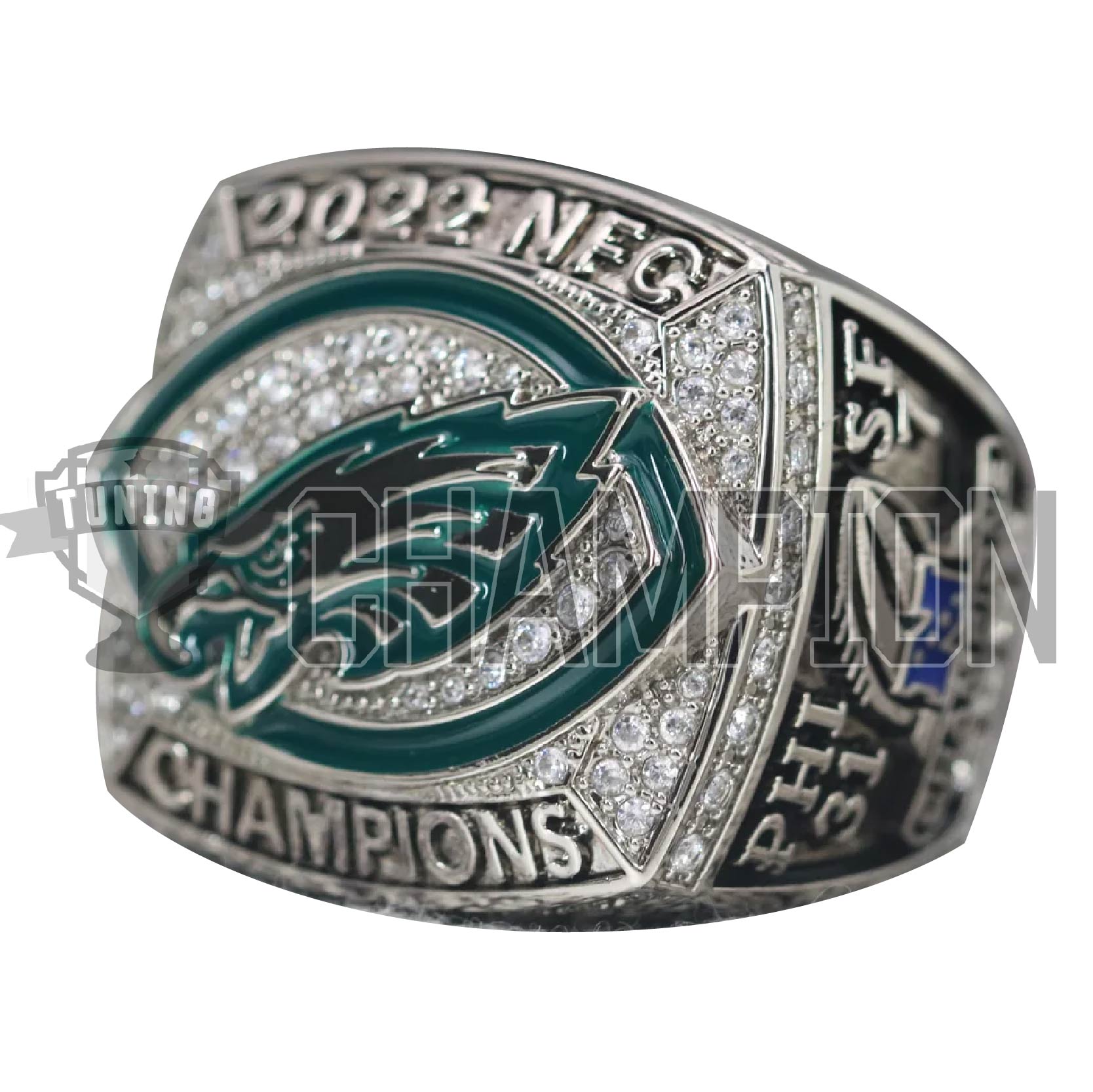 This ring is from the 2022 NFC Championship game between the Philadelphia Eagles and the San Francisco 49ers at Lincoln Financial Plaza. last the Eagles went on to win the NFC Championship against the San Francisco 49ers 31–7, advancing to Super Bowl LVII.